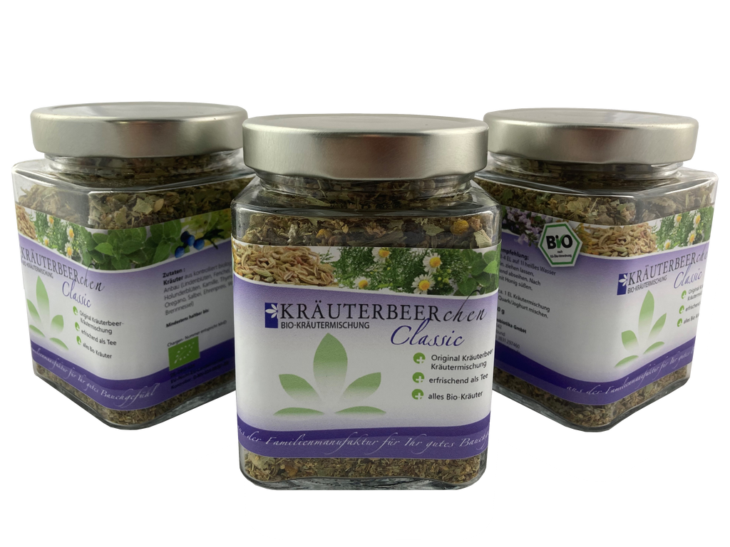 die Original-Kräutermischung des Kräuterbeer Classic im praktischen quadratischen Glas